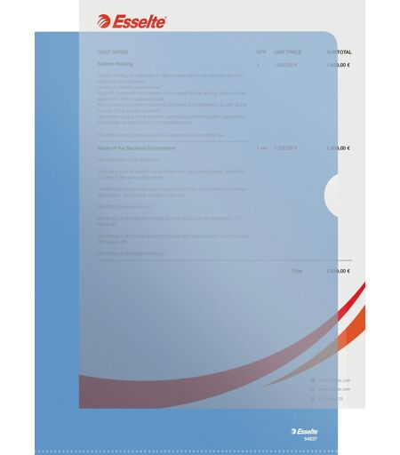 Esselte farvede plastomslag Opbevar dine papirer uden at hulle og arkivere dem. Velegnet til opdeling af større projekter og til at transportere dine papirer. Åben i top + højre side PP, Copy-Safe® kvalitet - bevarer og beskytter dine papirer og dæmper reflekterede lys Overflade med præg Materiale: Klar PP 105 micron (0,105mm) Nemt at læse gennem omslaget. Uden lysreflekser. Æske med 100 stk. Farve: Blå Bemærk! Prisen er for en æske/pose med 100 stk. Producentens varenummer: 54837 ...