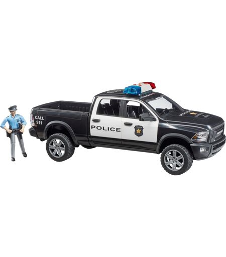 BRUDER-politiet modtager forstærkninger. For at kunne være aktiv væk fra byen, i svært tilgængeligt terræn, tilføjes en 4x4 politi pickup truck til BRUDER beredskabstjenester. Udrykningskøretøjet er baseret på den velkendte RAM 2500 og har, som det er sædvanligt i USA, et attraktivt iøjnefaldende farveskema og et Light &Sound-modul monteret på taget. Legetøjet er ligesom sin store rollemodel udstyret med den 4-dørs kabine, CREW Cab. Alle døre er åbne og giver plads til 4 bworld figurer. For kørekomfort og off-road kapacitet er denne model i skala 1:16 udstyret med fjederbelastede aksler, hvor forakslen kan styres med den medfølgende ratforlængelse. Bagklappen kan åbnes for transport under spildrift. Den inkluderede politimand er veludstyret og forberedt på en række mulige missioner. ...