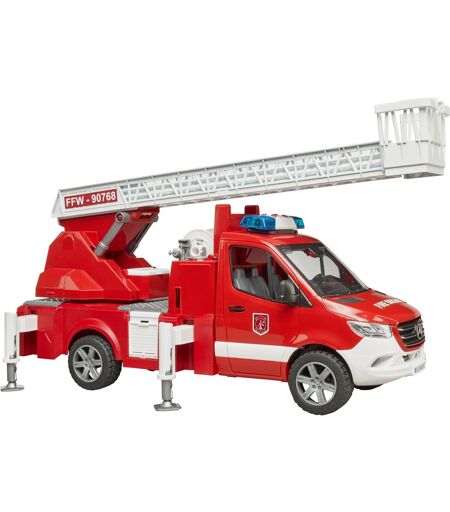 Fremadrettet, effektiv, pålidelig – sådan beskriver Mercedes Benz den nye Sprinter. Selv i den nyeste generation forbliver han den alsidige og altid populære transportprofessionelle. De nyeste Sprintere i en lang række varianter er ankommet til BRUDER''s omfattende sortiment. Mindre brandbiler bruges i stigende grad til brande, der er vanskelige at bekæmpe, for eksempel i smalle gasser fra den gamle bydel. Sprinter har vist sig fremragende på grund af sin enorme manøvredygtighed. BRUDER har udstyret denne brandbil med mange realistiske funktionelle detaljer. Fokus er på den udtrækkelige drejeskivestige med redningskurv og den fuldt funktionelle vandsprøjte med synligt fungerende stempelpumpe, vandtank og udtrækkelige støttefødder, forskellige værktøjsbeholdere samt det nye Light &Sound-modul afrunder køretøjets meget høje legeværdi. ...
