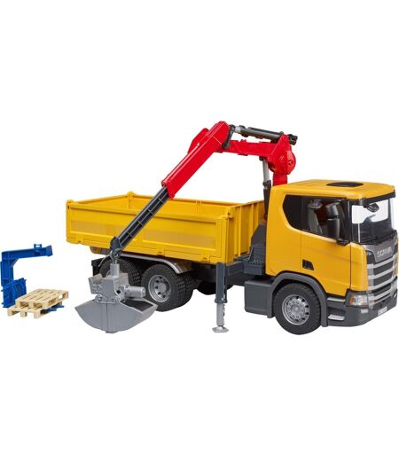Scania Super 560R-entreprenørlastbilens store forbillede er kendetegnet ved komfort og holdbarhed. Og denne model er også velegnet til en lang række situationer. Førerhuset har sidespejle, der kan foldes, og døre, der kan åbnes. Køretøjets karosseri har et vippende lastområde, tre sidevægge kan foldes ned. Bag førerhuset er en udfoldelig læssekran med teleskoparm, som kan drejes 360° og fastgøres i enhver position. For mere stabilitet under lastning har dette modelkøretøj udtrækkelige understøtninger. Der medfølger også en pallegaffel, en skovlgrab og to paller, så du straks kan starte på spilbyggepladsen. ...
