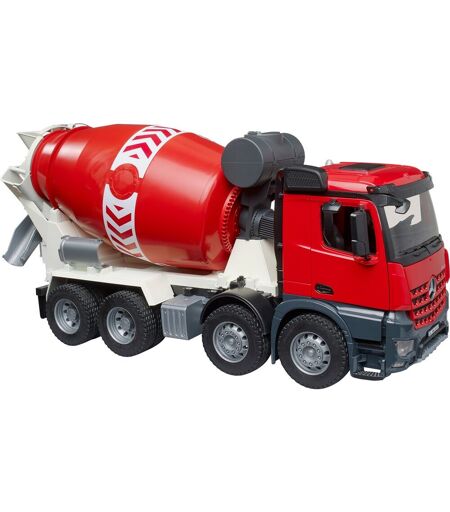 Kraft, robusthed og effektivitet er ofte afgørende på en arbejdsdag på veje og byggepladser. Derfor er Mercedes-Benz Arocs specielt udviklet til at opfylde disse behov. Ud over disse tekniske egenskaber er designet også blevet revideret i overensstemmelse hermed. For eksempel er fronten af kølergrillen designet i det typiske Arocs-look, som er beregnet til at udtrykke den enorme kraft. Også i denne model blev der lagt stor vægt på den sædvanlige robusthed for bruder, og førerhuset var udstyret med døre, der kunne åbnes, så bruderfigurerne kan komme ind. Betonblanderens tromle kan drejes med en håndsving, der foldes ud i vandtanken (tromle med skruetransportør og blandeskrue). Som med originalen sker tømning af tromlen ved at vende rotationsretningen. Skruen inde i tromlen transporterer derefter fyldmaterialet til bagsiden af udløbsskakten. Der er to stikkontakter til tilslutning. ...