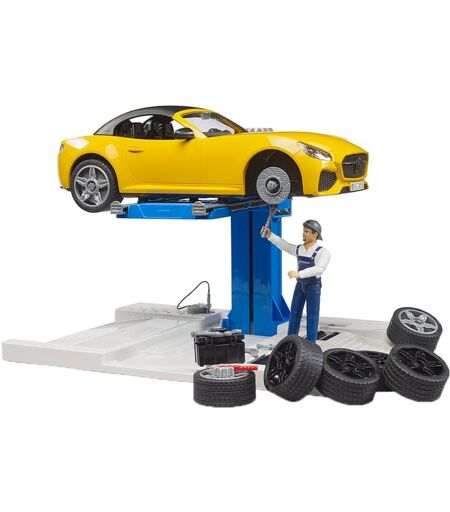 Velkommen til bworld, bruders spilverden. Det indeholder figurer, dyr, tilbehør og temasæt, der kan poseres. Uanset om det er som chauffør, rytter, vandsportsentusiast, på sygestuen eller i motorcykelværkstedet: bworld-artikler alene byder på en masse sjov og er den ideelle udvidelse til de detaljerede køretøjer. bworld Car Service Center er kontaktpunktet for et stort antal køretøjer, der kræver et syn. På den fuldt højdejusterbare platform kan den medfølgende mekanikerfigur inspicere køretøjerne og teste bremserne på testfaciliteten på samme tid. Resultatet vises med det samme på skærmen. Mindre reparationer kan udføres med det samme med det medfølgende værktøj, og til sidst kontrolleres dæktrykket. Inkluderet i dette fantastiske sæt er den knaldgule bror Roadster. Han har meldt sig selv til et dækskift. Reservehjulene er også inkluderet, og med Roadsters hjulskiftesystem er dette arbejde også udført på ingen tid. Denne model er lavet af robust plast og er velegnet til både indendørs og udendørs brug. ...