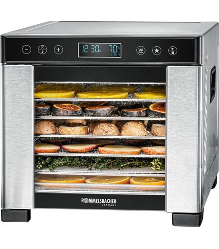 Med DA 650 dehydrator fra Rommelsbacher kan frugt, grøntsager, urter, svampe, kød eller fisk konserveres særligt skånsomt. Enheden har et robust, dobbeltvægget hus i rustfrit stål med praktiske forsænkede greb på siderne. DA 650 er udstyret med berøringssensorer, der er nemme og meget praktiske at bruge. Temperaturen kan justeres i trin på 5 °C fra 35 °C til 75 °C. DA 650 har syv tørregulve og har et samlet dehydreringsareal på 0,5 m². Den varme luft fordeles meget stille og jævnt inde i apparatet af en ventilator, så maden tørres jævnt på alle niveauer. Den foretrukne indstilling af varighed og temperatur samt hold varm-funktionen kan gemmes på knappen Favorit. Keep-warm-funktionen forhindrer følsomme dehydrerede fødevarer i at absorbere fugt fra den omgivende luft igen, hvis den ikke kan fjernes umiddelbart efter dehydreringsprocessen er afsluttet. Når den er aktiveret, skifter DA 650 automatisk til holdevarm-funktionen ved 35°C i 24 timer efter timeren er udløbet. Overophedningsbeskyttelsen og den automatiske sluk-funktion med signaltone sikrer den nødvendige sikkerhed. ...
