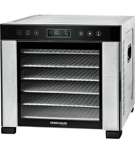 Med DA 950 dehydrator kan frugt, grøntsager, urter, svampe, kød eller fisk konserveres særligt skånsomt. Fugten fjernes forsigtigt fra maden. Vitaminer, mineraler og fibre bevares i vid udstrækning, resultatet er 100% naturligt, uden tilsætningsstoffer og konserveringsmidler. Frugtlæder, grøntsagschips, tørret frugt, ryk, men også godbidder til dyr eller smukke naturlige dekorationer kan laves med det. Dehydratoren har et robust, dobbeltvægget hus i rustfrit stål med praktiske forsænkede greb på siderne. Den er udstyret med berøringskontrolsensorknapper og et tydeligt frontdisplay. Temperaturen kan justeres i trin på 5 °C fra 35 °C til 75 °C med en 99-timers timer og automatisk sluk-funktion, et individuelt programmerbart favoritprogram og efterfølgende holde-varm-funktion. DA 950 har seks tørregulve og har et samlet dehydreringsareal på 0,60 m². Den varme luft fordeles meget stille og jævnt inde i apparatet af en ventilator, så maden tørres jævnt på alle niveauer. Det dobbeltvæggede hus giver fremragende varmeisolering, hvilket holder energiforbruget lavt. Overophedningsbeskyttelsen og den automatiske sluk-funktion med signaltone sikrer den nødvendige sikkerhed. ...