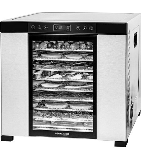 Med DA 1050 dehydrator kan frugt, grøntsager, urter, svampe, kød eller fisk konserveres særligt skånsomt. Fugten fjernes forsigtigt fra maden. Vitaminer, mineraler og fibre bevares i vid udstrækning, resultatet er 100% naturligt, uden tilsætningsstoffer og konserveringsmidler. Frugtlæder, grøntsagschips, tørret frugt, ryk, men også godbidder til dyr eller smukke naturlige dekorationer kan laves med det. Dehydratoren har et robust, dobbeltvægget hus i rustfrit stål med praktiske forsænkede greb på siderne. Den er udstyret med berøringskontrolsensorknapper og et tydeligt frontdisplay. Temperaturen kan justeres i trin på 5 °C fra 35 °C til 75 °C med en 99-timers timer og automatisk sluk-funktion, et individuelt programmerbart favoritprogram og efterfølgende holde-varm-funktion. DA 1050 har 10 tørregulve og har et samlet ekstra stort XXL-tørreareal på 1,60 m². Den varme luft fordeles meget stille og jævnt inde i apparatet af en ventilator, så maden tørres jævnt på alle niveauer. Det dobbeltvæggede hus giver fremragende varmeisolering, hvilket holder energiforbruget lavt. Overophedningsbeskyttelsen og den automatiske sluk-funktion med signaltone sikrer den nødvendige sikkerhed. ...
