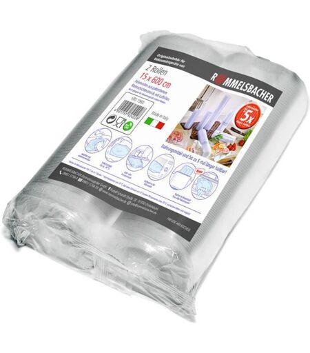 Brugen af originale Rommelsbacher MagicVac filmruller VRS 1560 sikrer fejlfri og hurtig støvsugning med Rommelsbach vakuumforseglere. Den patenterede 2-lags kvalitet samt den specielle korrugering sikrer de bedste støvsugningsegenskaber og holder maden frisk op til 5 gange længere. I filmene kan maden opbevares i fryseren på en pladsbesparende og sikker måde, før den fryser ild og derefter opvarmes i mikrobølgeovnen, for eksempel. De er varmebestandige op til 100 °C, så maden kan opvarmes i et varmtvandsbad. Disse specialposer er også ideelle til den stadig mere populære sous vide-madlavning (vakuumkogning ved lav temperatur). Den robuste kvalitet muliggør en miljøvenlig multibrug, du kan blot skylle dem godt og bruge dem igen og igen. Ud over mad kan andre ting også opbevares beskyttet i VRS 1560-filmene. Vakuum beskytter smykker mod pletter og beskytter følsomme ting (f.eks. Bandager eller campingartikler) mod fugt og snavs. ...