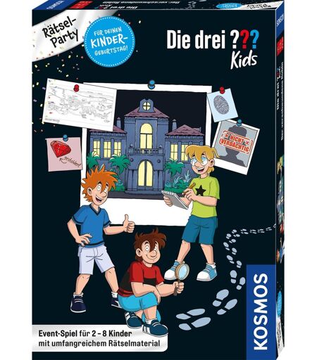 Hvem stjal den dyrebare ædelsten? Under en havefest i en villa i Rocky Beach forsvandt rubinen pludselig. Alle gæsterne til festen er mistænksomme! Siden de tre ??? Børn har travlt med en anden sag, to til otte børn overtager efterforskningen. En spilmester skjuler sporene i forskellige rum. Nu er det tid til at søge: I del et af forbryderpartiet identificeres gerningsmanden, i del to søges ædelstenens hemmelige skjulested - dette kan også være en skattejagt udendørs. Hver del giver sjov og puslespil i op til 45 minutter. Fantastisk detektivsjov med varierede puslespil til børn fra syv år - for eksempel til børnenes fødselsdag med lidt forberedelsesindsats for forældrene! ...