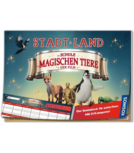 Er du klar til noget magisk puslespilssjov? "City - Country - The School of Magical Animals" af KOSMOS giver den klassiske by-land-flod et magisk touch! Fordyb dig i filmverdenen "The School of Magical Animals" med 21 forskellige kategorier, der vil udfordre og inspirere dig. Er du fan nok til at få dobbelte point? Grib en kuglepen, og tag på din kreative rejse fra Köln til Canada, fra Kater Karajan til ...? Spækket med populære figurer som skildpadden Henrietta, pingvinen Juri og den smarte ræv Rabbat, er denne spilblok den perfekte følgesvend for filmfans og gættende ræve fra otte år og opefter. ...