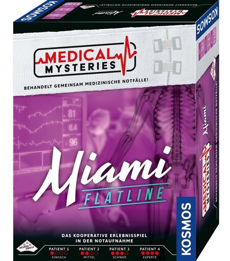 Fordyb dig i medicinens verden - i Miami! Med dette spil fra "Medical Mysteries"-serien glider de en til seks spillere ind i rollerne som læger på skadestuen. Holdet skal arbejde hårdt og arbejde sammen for at hjælpe patienterne og løse de mystiske nødsituationer. For at gøre dette undersøges symptomer, og sygehistorier gennemgås for at træffe de rigtige behandlingsbeslutninger. De nødvendige medicinske oplysninger vil blive givet i løbet af spillet. At følge spor, udføre tests, undersøge og bruge instinkter - mange mulige veje fører til forskellige resultater. Løses komplikationer godt, og bliver patienterne hjulpet i tide? Et kooperativt eventyrspil med enkle regler og spændende omgivelser. ...