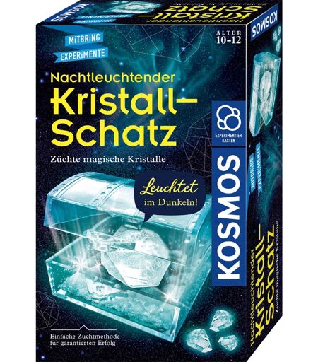 Glitrende krystaller, der lyser i mørket: Med dette eksperimentsæt fra KOSMOS kan børn fra ti år dyrke deres egen natlige krystalskat. Håndteringen er enkel og særlig pålidelig: Når alunkrystalopløsningen er blevet blandet, fyldes den i den specielt udleverede skattekiste, og efter blot et par timer kan du se krystalskatten vokse. Brystets specielle bundindlæg giver en mystisk glød af de gennemsigtige krystaller i mørket. Dette forvandler ethvert børneværelse til en mystisk, glødende skattekiste! ...
