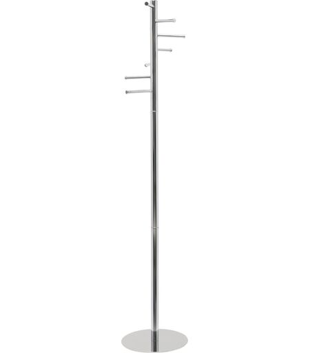 Moderne stumtjener i krom Denne elegante NAGA stumtjener kombinerer stabilitet og pladsbesparende design med et moderne, metallisk look. Med søjle, bund og kroge i forkromet højglans, passer den diskret ind i ethvert miljø, fra indgangspartier til kontorer og hjem. De forskudte tøjstænger fordeler belastningen og giver let adgang til dit tøj. De syv fastskruede metal tøjstænger med metal endestykker sikrer, at dit tøj og tilbehør hænger sikkert. Den solide, elastiske søjle med sølvmetalafstandsstykker giver et sikkert hold, mens den flade bundplade i massivt stål med en stor diameter sikrer perfekt stabilitet og mindsker risikoen for at den vælter. Stumtjeneren er nem at montere og er udstyret med fem gulvvenlige filtpuder, der beskytter dit gulv. Specifikationer: Farve: Blank krom Knager: 7 stk. Højde: 177,0 cm Diameter af fod: 35,0 cm Diameter af søjle: 4,0 cm Vægt: 3,6 kg 2 års garanti ...
