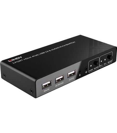 HDMI 4K60, USB 2.0 og Audio KVM-switchen med 2 porte giver en kompakt løsning til at få adgang til og styre op til to HDMI-udstyrede pc''er fra et enkelt tastatur, mus og skærm. Opløsninger på op til maks. 4K Ultra HD 60Hz understøttes. Lydudgangene på hovedenheden kan også bruges til at tilslutte hovedtelefoner eller højttalere og en mikrofon; Ved at trykke på Audio On/Off-knappen på forsiden kan disse enheder slås fra. Disse stik er ikke parret med den indlejrede lydstrøm af HDMI-signalet, men med en indbygget USB-konverter. En anden USB-enhed, såsom en printer, scanner eller ekstern masselagerenhed, kan tilsluttes den ekstra USB-port på forsiden af kontakten. KVM-switchen har to skiftemuligheder: trykknapper på enheden og tastaturgenvejstaster. ...