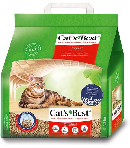 Cat´s Best Original er det første kattegrus, der kombinerer natur og hi-tech. Teknologisk raffinerede aktive træfibre absorberer øjeblikkeligt væsker og lugte og indkapsler dem dybt inde. Naturligt og uden kemiske tilsætningsstoffer. Så Cat's Best kan forblive i kattebakken i meget længere tid - op til 7 uger. Arbejdet med rengøring og påfyldning af bakken reduceres til et minimum. Dette hjælper også med at reducere omkostningerne. Cat's Best Original fungerer bedst, hvis du blot smider de faste klumper, der dannes i bioaffaldet eller i husets toilet. (*overhold de lokale regler). Cat's Best benytter udelukkende PEFC-certificerede træfibre, der er lavet af sekundære råmaterialer, ingen træer er fældet!! Cat's Best er en ny generation af bæredygtigt kattegrus. Cat's Best er lavet af vedvarende og certificerede råvarer og er helt bionedbrydeligt. Dette hjælper miljøet og sikrer en naturlig, behagelig renlighed for katte og mennesker derhjemme. Cat's Best Original i overblik: Klumpende, funktionelt kattegrus Fra teknologisk raffinerede aktiv-træfibre Naturligt og uden kemiske tilsætningsstoffer Ekstremt lugtfri: naturligt duftende - uden kunstige tilsætningsstoffer (rent naturprodukt) Meget drøj i brug: en 4,5 kg / 10 liters pose holder op til 7 uger i kattebakken Op til 700 % væskeopsamling: enestående sugeevne giver tørre poter og optimal væskebinding Kan skylles ud i toilettet: Cat's fremstilles af naturlige plantefibre, og opløses derfor i toiletkummen ligesom toiletpapir. Dermed skaber kattegruset hverken problemer i afløbet eller rensningsanlægget. Bæredygtig PEFC-certificeret: træfibrene er lavet af sekundære råmaterialer, ingen træer er fældet Støvfattigt Ekstra finkornet: Ekstra blød mod sarte kattepoter for maksimal komfort Blid mod poterne og blid mod parkettet Nemt at transportere: op til 50 % lettere end almindeligt grus Brugerråd: Bortskaffelse via toilettet må kun foretages i rimelige mængder! Placer den enkelte klump i toilettet og lad den suge vand i kort tid. Skyl derefter kraftigt - vandet skal skylle og sprede klumppartiklerne tilstrækkeligt. Først derefter placeres den næste klump i toilettet. Det er endnu nemmere, hvis klumperne knuses med skovlen på forhånd. Vandet skal kunne sprede, opløse og opløse klumppartiklerne - så fungerer alt nemt, rent og hygiejnisk. Husholdningstoilettet er ikke egnet til bortskaffelse og resttømning af en brugt kattebakke. Brug kompost eller restaffald i henhold til lokale regler for bortskaffelse! Tilbage til Cats Best kattegrus. ...