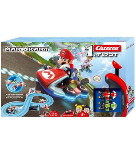 Analog bilbane i skala 1:43 for de yngste med biler fra Mario-verdenen og kørerne Mario og Yoshi. Banelængde på 2,4 m med bro, spinnere og udskåret billede af Mario, som er placeret i midten af en tur. De første kurser fra Carrera er ekstra børnevenlige og sikre, da de bruger 4x C-batterier (købes separat) i stedet for stikkontakten.PS! Produktteksten er maskineoversat fra norsk. Indhold * 2X biler fra Mario Kart * 2,4 M bilspor med bro og udskåret billede * 2X håndkontroller med hastighedsjustering * Tilslutningstilbehør Specifikationer Dimensioner 93 Cm 45 Cm Kursuslængde 2,4 M Vægt 01:43 Passende alder 3+ ...