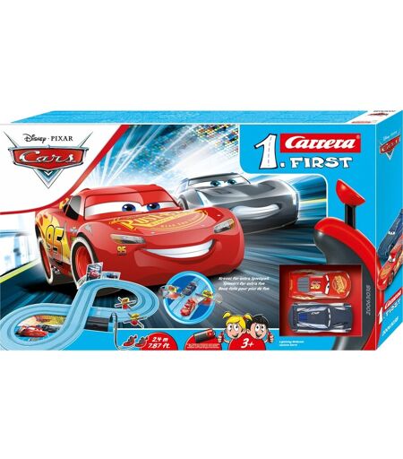 Sjove løb med stjernerne fra Disney Pixar Cars: I duellen mellem giganterne fra de små racerkørere fra 3 år starter Lightning McQueen og Jackson Storm deres spændende eventyr i Carrera FIRST "Disney Pixar Cars - Power Duel". De to er konkurrenter på en racerbane af de kendte børnefilm, men viser på Carrera, at de også kan have det sjovt sammen. Biler kommer til live på Carrera: Carrera FIRST racerbanen er perfekt til unge racerkørere og giver nem adgang til Carrera-verdenen. På den 2,4 meter lange racerbane i form af en otter giver roterende gyroskoper endnu mere sjov og action. Trofaste dekorative elementer til racerbanen kan skæres ud af emballagen og kærligt iscenesættes. Sættet indeholder to håndkontrollere, som er særligt velegnede til børns hænder. Fire Type C-batterier er nødvendige for at styre bilerne. Start nu med dine venner i de sjove løb med dine yndlingsracere. ...