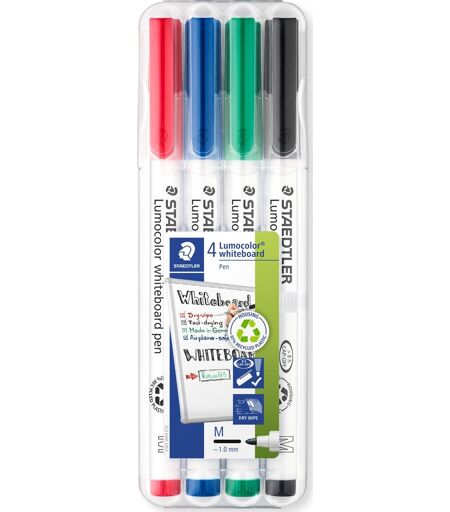 Staedtler Lumocolor 301 whiteboard markersæt – perfekt til mindre whiteboards Staedtler er en af verdens førende producenter af skriveartikler. De gode produkter produceres i Tyskland og skabes gennem en kombination af tradition og nytænkning, håndværk og teknologi, design og funktionalitet. Whiteboard penne fra Staedtler er gode til præsentationer, fremlæggelser, konferencer og undervisningsbrug. Lumocolor 301 serien har en rund spids, med en skriftstreg på ca. 1 mm, og indeholder hurtigtørrende blæk. Pennene leveres i en smart stand-up box, så det er hurtigt og nemt at skifte imellem dem og så de ikke bliver væk. Med Lumocolor 301 kan du skrive på whiteboards, samt glas og porcelæn. Pennene indeholder hurtigttørrende blæk uden kemiske stoffer såsom xylen og toluene og du slipper samtidig for lugten af sprit. Du kan hurtigt og nemt fjerne pennene fra whiteboards og glatte overflader som glas og porcelæn, helt uden at de efterlader spor. Pennene har desuden en praktisk ”cap-of” funktion, så pennen kan tåle at ligge uden hætte i op til 8 timer, uden at den tørrer ud. Pennene er desuden designet med det særlige AIRPLANE SAFE system, som gør, at du kan have dem med i kufferten uden at de lækker når de udsættes for tryk. Farve: Rød, blå, grøn, sort Stregbredde: Ca. 1 mm Spids: Rund Hurtig tørring Pennehylsteret er fremstillet af 97% genanvendt plast Stand-up etui med 4 stk. markere ...