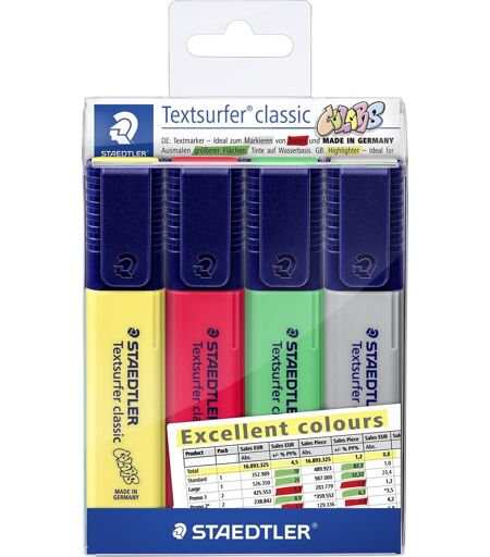 Staedtler Textsurfer Excellent Colors sæt – gode overstreningspenne i stærke farverStaedtler er en af verdens førende producenter af skriveartikler. De gode produkter produceres i Tyskland og skabes gennem en kombination af tradition og nytænkning, håndværk og teknologi, design og funktionalitet.De klassiske textsurfere fra Staedtler er gode overstregningspenne i flotte og stærke farver. Textsurferne har en ultrablød skrå spids, med en skriftstreg på ca. 1-5 mm og indeholder vandbaseret og hurtigtørrende blæk. Med Textsurfer Excellent Colors kan du lave overstregninger på de fleste typer papir og farverne er ”rigtige” farver og er derfor mere dækkende end fluorescerende farver. Farverne i dette sæt matcher desuden de farver man ofte bruger til markeringer og overstregninger når man arbejder i Excel-ark, regneark og regnskaber. Textsurferne giver derfor en tydelig og markant overstregning, så du altid er sikker på at de vigtige nøgletal, regnskabstal, samt aktuelle pointer og stikord fremstår helt klart og tydeligt. Overstegningspennene er desuden designet med det særlige AIRPLANE SAFE system som gør, at du kan have dem med i kufferten uden at de lækker når de udsættes for tryk.Sæt med 4 stk. textsurfereFarve: Gul, rød, grøn, gråStregbredde: Ca. 1-5 mmSpids: Skråskåret Vandbaseret blæk ...