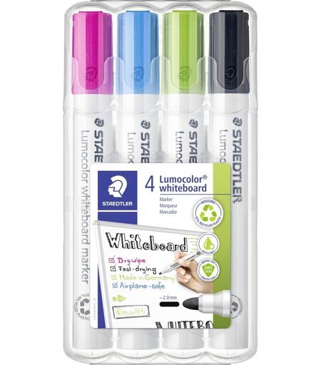 Staedtler Lumocolor 351 whiteboard markersæt med 4 stk. – perfekt til konferencer og undervisningsbrug Whiteboard penne fra Staedtler er gode til præsentationer, fremlæggelser, konferencer og undervisningsbrug. Lumocolor 351 serien har en rund spids, med en skriftstreg på ca. 2 mm, og indeholder hurtigtørrende blæk. Pennene leveres i en smart stand-up box, så det er hurtigt og nemt at skifte imellem dem og så de ikke bliver væk. Med Lumocolor 351 kan du skrive på whiteboards, samt glas og porcelæn. Pennene indeholder hurtigttørrende blæk uden kemiske stoffer såsom xylen og toluene, og du slipper derfor for lugten af sprit. Du kan hurtigt og nemt fjerne pennene fra whiteboards og glatte overflader som glas og porcelæn, helt uden at de efterlader spor. Blækket er desuden DRY SAFE, så du er sikret markere der kan tåle at ligge uden hætte, uden at de tørrer ud. Pennene er desuden designet med det særlige AIRPLANE SAFE system, som gør, at du kan have den med i kufferten uden at de lækker når de udsættes for tryk. Farve: Pink, lyseblå, lysegrøn, sort Stregbredde: Ca. 2 mm Spids: Rund Hurtig tørring Pennehylsteret er fremstillet af 97% genanvendt plast Stand-up etui med 4 stk. markere ...