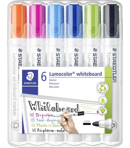 Staedtler Lumocolor 351 whiteboard markersæt med 4 stk. – perfekt til konferencer og undervisningsbrug Whiteboard penne fra Staedtler er gode til præsentationer, fremlæggelser, konferencer og undervisningsbrug. Lumocolor 351 serien har en rund spids, med en skriftstreg på ca. 2 mm, og indeholder hurtigtørrende blæk. Pennene leveres i en smart stand-up box, så det er hurtigt og nemt at skifte imellem dem og så de ikke bliver væk. Med Lumocolor 351 kan du skrive på whiteboards, samt glas og porcelæn. Pennene indeholder hurtigttørrende blæk uden kemiske stoffer såsom xylen og toluene, og du slipper derfor for lugten af sprit. Du kan hurtigt og nemt fjerne pennene fra whiteboards og glatte overflader som glas og porcelæn, helt uden at de efterlader spor. Blækket er desuden DRY SAFE, så du er sikret markere der kan tåle at ligge uden hætte, uden at de tørrer ud. Pennene er desuden designet med det særlige AIRPLANE SAFE system, som gør, at du kan have den med i kufferten uden at de lækker når de udsættes for tryk. Farve: Orange, pink, lyseblå, blå, lysegrøn, sort Stregbredde: Ca. 2 mm Spids: Rund Hurtig tørring Pennehylsteret er fremstillet af 97% genanvendt plast Stand-up etui med 6 stk. markere ...