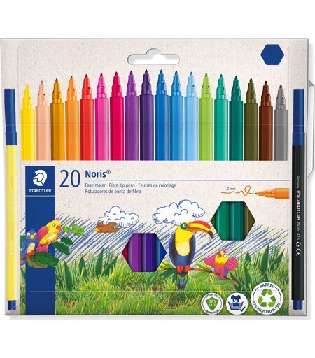 Staedtler Noris 326 Tusser Med tusser i Noris serien, får du gode standardtusser til hverdagen. Noris 326 tusserne har en robust, stabil og trykfast spids, der tåler et hårdt og vedvarende tryk under brug. Tusserne er produceret med vandbaseret blæk hvor farvestofferne er levnedsmiddelsbaserede, som hvor gør at farverne nemt kan vaskes af de fleste tekstiler. Desuden indeholder tusserne DRY SAFE blæk, så de kan tåle at ligge uden hætte i flere dage uden at tørre ud. Noris 326 er et oplagt valg til skoler og institutioner og kan bruges til både skrivning, tegning og farvelægning, hvilket giver masser af kreative muligheder. Sæt med 20 forskellige farver Stregbredde: Ca. 1 mm Vandbaseret blæk med levnedsmiddelsbaserede farvestoffer DRY SAFE teknologi som sikrer blækket mod udtørring Ventileret hætte Pennehylster i 97% genanvendt plast Leveres i papæske i min. 80% genanvendt pap Produceret i Tyskland DRY SAFE blæk Noris 326 tusserne indeholder et innovativt DRY SAFE blæk, som sikrer at tusserne kan ligge uden hætte i dagevis uden at tørre ud. Blækkets særlige formel sikrer jævne og klare farver, samtidig med at det beskytter dine tusser mod udtørring, hvilket forlænger deres levetid. Ventileret sikkerhedshætte Noris 326 tusserne har fremstillet med en ventileret sikkerhedshætte som lever op til ISO 11540 og BS 7272-1/2 standarderne, hvilket sikrer børns sikkerhed under brug, da den sikrer iltpassage til luftvejene, hvis uheldet er ude og hætten sluges. Staedtler - førende producent indenfor skriveartikler Staedtler er en af verdens førende producenter af skriveartikler. De gode produkter produceres i Tyskland og skabes gennem en kombination af tradition og nytænkning, håndværk og teknologi, design og funktionalitet. ...