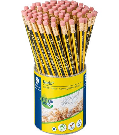 Staedtler Noris 122 blyant med viskelæder Blyant i høj kvalitet med viskelæder i toppen. Staedtler Noris 122 blyanten har en blød, skridsikker overflade, hvilket giver et godt greb og en afslappet og let skriveoplevelse. Dertil har blyanten et praktisk viskelæder i toppen, så du altid er klar til at rette småfejl, hvilket gør blyanten oplagt til både skrivning og tegning og kan med fordel bruges på kontoret, i skolen, på uddannelsesinstitutioner eller i hjemmet. Staedtler Noris 122 blyanten er utrolig brudsikker, takket være en særlig bundet blytype. Samtidig er blyanten nem at udviske og spidse. Kontorblyanten er fremstillet af PEFC-certificeret træ hvilket betyder at blyanten er produceret af træ fra certificerede og forsvarligt forvaltede skove. Dertil er blyanterne fremstillet i Upcycled Wood, som er træflis og overskudstræ som primært kommer fra tyske skovbrug. Noris 122 blyanten kommer her i et smart klassesæt med 72 blyanter i praktisk plastrør, så der er blyanter nok til alle uanset om røret stilles på kontoret eller på uddannelsesinstitutionen. Hårdhed: HB Stregbredde: 2 mm Farve: Gul/sort stribet Praktisk viskelæder i toppen PEFC-certificeret træ Plastrør med 72 stk. Fremstillet af Upcycled Wood Noris 122 blyanter er fremstillet af innovativt Upcycled Wood, som er fremstillet af restmaterialer og overskudstræ fra den tyske træ- og møbelindustri. Overskudstræet og resttræet fra møbel- og træproduktionen genanvendes og omdannes til kvalitetsblyanter. Blyanterne er fremstillet af den overskydende træflis fra tyske savværker og selv de mindste trærester bliver brugt til fremstillingen af blyanter, så der ikke går noget til spilde. ...