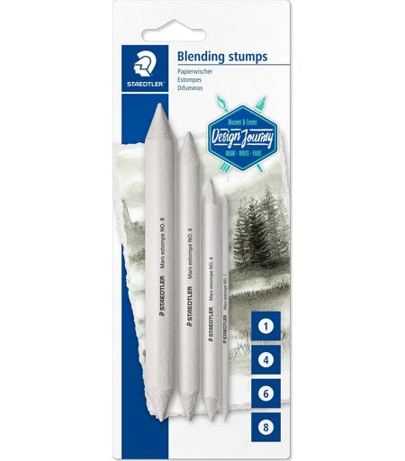 Staedtler Design Journey Papir Stumps – til bløde overgange i dine tegninger Staedtler Design Journey serien er til dig der ønsker at udleve din helt egen kreative rejse, da serien er skabt med det formål at inspirere dig og gøre dig nysgerrig på kreativitetens mange muligheder. Design Journey giver dig nemlig alle de værktøjer, du har brug for til at finde din helt egen kunstneriske vej.Med Staedtler Design Journey Papir Stumps får du fire alsidige Papir Stumps, også kendt som blending stumps eller tegnestubber, i forskellige størrelser. Tegnestubber er særlig velegnet til at lave udtoninger og detaljer på de fleste udtværelige materialer som kul, blyant, kridt og pastelkridt mm. Tegnestubberne kan slibes ren med sandpapir. 4 papirstump i forskellige størrelser Velegnet til kul, blyant, kridt og pastelkridt mm. Kan slibes med sandpapir for rengøring. ...
