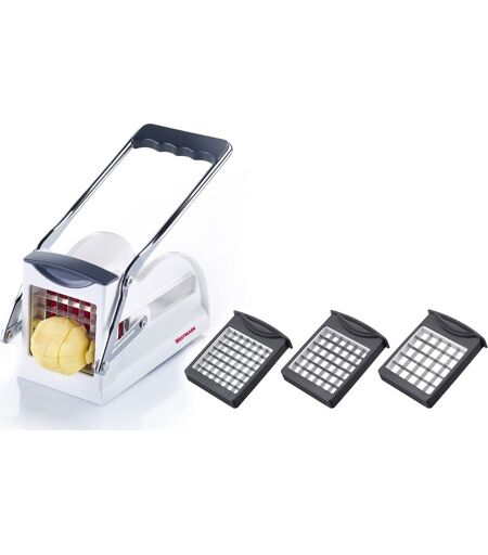 Westmark Pommes Frites Jern Easy Stix, plast – lav sprøde pommes frites og sunde snacks Westmark Easy Stix pommes frites jern gør det nemt at skære perfekte pommes frites og snack-stave af grøntsager og frugt. Med tre udskiftelige knivenheder (9x9 mm, 10x10 mm og 12x12 mm) kan du skabe præcise skiver, ideelle til fingerfoods og sunde snacks. Den skridsikre sugekop på bunden sikrer stabilitet under brug. Bemærk: Ikke egnet til søde kartofler. Til langvarig brug og skarpe skær anbefales håndvask. Specifikationer: Materiale: Rustfrit stål, ABS og TPE-plast Farve: Hvid og grå Længde: 24 cm Bredde: 8,5 cm Højde: 11 cm Anvendelse: Skæring af pommes frites og grøntsagsstave i tre størrelser Rengøring: Håndvask anbefales Westmark Easy Stix – sprøde fritter og sunde snacks gjort nemt Med de skarpe knivenheder og en sikker sugekop til stabilitet skaber Easy Stix både pommes frites og kreative grøntsagsstave, perfekt til børn og voksne. ...