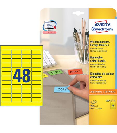 Avery farvede etiketterFarvede aftagelige etiketter er nemmere at få øje på. Når der er mange forskellige projekter i gang kan det være svært at holde styr på hvilke opgaver der haster mest. Hvis du farvekoder opgaverne med Avery's L6041-20 aftagelige gule etiketter med 48 etiketter/ark og 960 etiketter/pakke kan hele teamet nemt få overblik over de opgaver der ligger. Du kan f.eks. bruge de røde etiketter til at mærke de opgaver der haster og skal løses i denne uge, og de gule til de opgaver der kan vente lidt. Eller du kan farvekode opgaverne efter hvilket projekt de høre under, det er helt op til dig – Du vælger blot det system der passer bedst til dig og dit team. Etiketterne er aftagelige, og kan nemt fjernes uden at efterlade limrester, hvilket gør dem perfekte til midlertidig mærkning. Kan printes i alle printere, og Avery's JamFREE™ garanti sikrer at du ikke behøver bekymre dig om etiketterne sidder fast i printeren og giver printerstop. På www.avery.eu finder du masser af skabeloner hvor du kan nemt og GRATIS kan designe og printe dine Avery etiketter.Egenskaber:45,7 x 21,2 mmFarvelaser / Inkjet / Laser / KopiTil: OrganiseringFarve: Gul960 etiketter pr. pakke20 ark pr. pakke48 etiketter pr. arkPermanent limFirkantetPå A4 arkDette produkt er lavet af FSC®-certificeret papir og et bagpapir med lim. ...