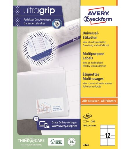 Avery 3424 Universaletiketter til generelle formål, 105 x 48 mm, 1.200 Etiketter, HvidUniversaletiketter kan bruges i både s/h, farvelaser og inkjet printere samt kopimaskiner. Præcis udskrivning uden papirstop med Ultragrip feature. Etiketterne er velegnet til mange forskellige formål, f.eks. som adresseetiketter eller til vedvarende mærkning af genstande. Pålidelig permanent klæbeevne på alle glatte overflader. Til indendørs brug. Design og print nemt og GRATIS på www.avery.eu.Universaletiketter kan printes i alle printereMed Ultragrip for præcis udskrivning uden papirstopVelegnet til mange forskellige formålDette produkt er lavet af FSC®-certificeret papir og et bagpapir med lim.Design og print nemt med GRATIS skabeloner på www.avery.eu ...