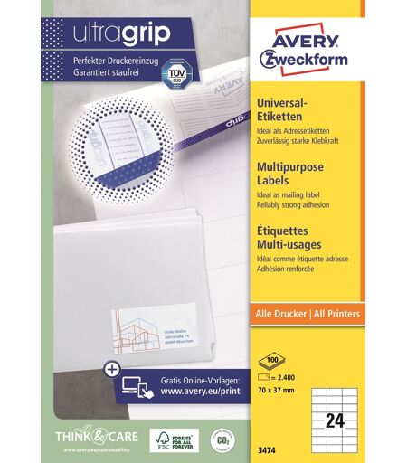 Avery 3474 Universaletiketter til generelle formål, 70 x 37 mm, 2.400 Etiketter, HvidUniversaletiketter kan bruges i både s/h, farvelaser og inkjet printere samt kopimaskiner. Præcis udskrivning uden papirstop med Ultragrip feature. Etiketterne er velegnet til mange forskellige formål, f.eks. som adresseetiketter eller til vedvarende mærkning af genstande. Pålidelig permanent klæbeevne på alle glatte overflader. Til indendørs brug. Design og print nemt og GRATIS på www.avery.eu.Universaletiketter kan printes i alle printereMed Ultragrip for præcis udskrivning uden papirstopVelegnet til mange forskellige formålDette produkt er lavet af FSC®-certificeret papir og et bagpapir med lim.Design og print nemt med GRATIS skabeloner på www.avery.eu ...