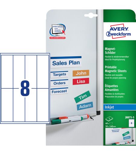 Avery magnetiske skilte til print er perfekte til lagerreoler og alle typer metaloverflader Design og print dine egne magneter på få minutter til opsætning på metalhylder, whiteboards, køleskabe m.m. Velegnet som advarselsskilte, påbudskilte eller oplysningsskilte, som skal kunne flyttes rundt - de er nemlig nemme at flytte rundt på! Enkel at anvende med GRATIS Avery Wizard software til Microsoft Office. Se mere på www.avery.dk Farve: Hvide 40 etiketter pr. pakke Antal etiketter pr. A4 ark: 8 stk. 5 ark pr. pakke Magnetiske Mål: 50 x 140 mm Printer: Inkjet ...