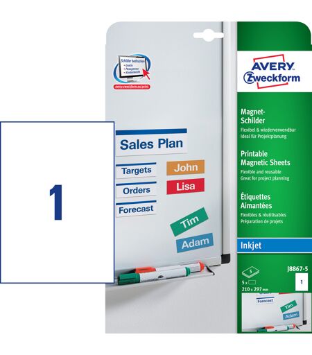 Avery magnet etiketter er ideel til lagerreoler og whiteboardsBruger du whiteboardtavlen til projektstyring? Har du varer på metalhylder og har brug for aftagelige skilte til produktinformation? Eller måske bruger du køleskabet til at planlægge og fordele opgaver i hjemmet og på kontoret? Med Avery's J8867-5 magnetiske skilte 210 x 297 mm med 1 skilt/ark og 5 ark/pk kan du selv nemt printe dine egne magnetiske skilte.Skiltene hæfter magnetisk på alle metaloverflader, og kan derfor nemt flyttes rundt og genplaceres hvilket gør dem egnede til f.eks. projektstyring og team planlægning på en whiteboardtavle, familieplanlægning eller beløningsskema på køleskabet, eller som information på hylder, reoler og mandskabsskabe. De er kompatible med alle standard inkjetprintere. På www.avery.dk finder du masser af skabeloner hvor du kan nemt og GRATIS kan designe og printe dine Avery skilte.Farve: Hvide1 etiket pr. A4 ark5 A4 ark med 1 etiket pr. pakkeMagnetiskRektangulærMål: 210 x 297 mmPrinter: Inkjet ...