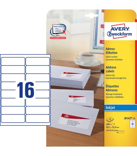 Avery adresseetiketterAdresse etiketterne er velegnede til breve, pakker og rør i alle størrelser.Arbejder du hovedsagligt med en inkjetprinter og har du ikke tid til at vente på at blækket tørrer, så skal du vælge Avery J8162-25 hurtigtørrende etiketter til inkjet printere med 16 etiketter/ark og 400 etiketter/pk. Deres special coatede QuickDRY™ overflade sørger for at blækket øjeblikkeligt absorberes i papiret, så du kan tage arket direkte fra printeren og arbejde med det uden afsmitning af blæk. Avery's JamFREE™ garanti sikrer at du ikke behøver bekymre dig om etiketterne sidder fast i printeren og giver printerstop. På www.avery.eu finder du masser af skabeloner hvor du kan nemt og GRATIS kan designe og printe dine Avery etiketter.Egenskaber:99,1 x 33,9 mmInkjet400 etiketter pr. pakkeTil: Adressering / ForsendelseFarve: HvidAnbefalet til: Små breve25 ark pr. pakke16 etiketter pr. arkPermanent limFirkantetPå A4 arkDette produkt er lavet af FSC®-certificeret papir og et bagpapir med lim. ...