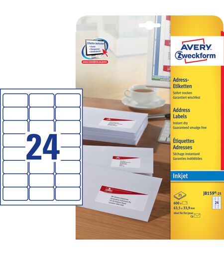 Avery adresseetiketterAdresse etiketterne er velegnede til breve, pakker og rør i alle størrelser. Arbejder du hovedsagligt med en inkjetprinter og har du ikke tid til at vente på at blækket tørrer, så skal du vælge Avery J8159-25 hurtigtørrende etiketter til inkjet printere med 24 etiketter/ark og 600 etiketter/pk. Deres special coatede QuickDRY™ overflade sørger for at blækket øjeblikkeligt absorberes i papiret, så du kan tage arket direkte fra printeren og arbejde med det uden afsmitning af blæk.Avery's JamFREE™ garanti sikrer at du ikke behøver bekymre dig om etiketterne sidder fast i printeren og giver printerstop. På www.avery.eu finder du masser af skabeloner hvor du kan nemt og GRATIS kan designe og printe dine Avery etiketter.Egenskaber:63,5 x 33,9 mmInkjet600 etiketter pr. pakkeTil: Adressering / ForsendelseFarve: HvidAnbefalet til: Små breve25 ark pr. pakke24 etiketter pr. arkPermanent limFirkantetPå A4 arkDette produkt er lavet af FSC®-certificeret papir og et bagpapir med lim. ...