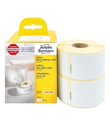 Avery Adresseetiketter 36 x 89 mm 520 stk. Har du brug for etiketter til din DYMO® LabelWriter™ eller Seiko Smart Label Printer®? Avery's AS0722400 adresseetiketter på rulle til etiketprintere, svarer til DYMO® S0722400 og Seiko® SLP 2RLE, og er 100% kompatibel med DYMO® LabelWriter™ LW310, LW330T, LW400 serie, LW450 Series, 4XL, LW Wireless og Seiko Smart Label Printer®! Med denne pakke får du Avery's velkendte kvalitetsetiketter til en meget attraktiv pris. I pakken er der 2 ruller med 260 etiketter. etiketstørrelsen er 36 x 89 mmr. De er velegnede til breve, post og andre forsendelser. Du kan nemt og efter behov printe en eller flere etiketter ad gangen, og med DYMO® eller Seiko® Software kan du nemt designe og printe dine personlige etiketter. VIGTIGT: Undgå permanent kontakt med rengøringsmidler. Etiketprinteren bruger termisk udskrivning, og etiketten er derfor ikke UV-bestandig. Undgå permanent eksponering for direkte sollys, da dette vil misfarve etiketten. Farve: Hvid Mål: 36 x 89 mm 260 etiketter pr. rulle 2 ruller pr. pakke 520 etiketter pr. pakke Dette produkt er lavet af FSC®-certificeret papir og et bagpapir med lim. 100% kompatibel med Dymo® LabelWriter™ & Seiko Smart Label Printer ...