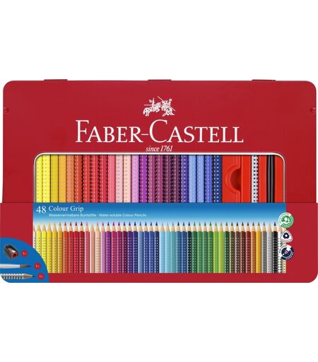 Faber-Castell Grip Farveblyanter – gode farveblyanter i anerkendt kvalitet Grib farveblyanterne fra Faber-Castell, er udformet til at give dig den bedste og mest underholdende tegneoplevelse. Med det trekantede og ergonomiske greb er du sikret en træthedsfri og behagelig tegning, så du kan tegne løs, uden at blive træt og øm i hånden. Samtidig sikre de bløde gribedupper at blyanterne er nemme at holde om. Stiften i farveblyanterne er lysægte, så du får farver der er fulde af liv og intensitet og som holder længe. Samtidig er stiften fuldt integreret med træet i farveblyanten så den bliver ekstra brudsikker og kan tåle hårdt og vedvarende tryk. Farverne er vandopløselige, så du kan bruge en pensel til at lægge vand på dine tegninger og skabe flotte akvarelbilleder og effekter. Da farverne er vandopløselige kan de også nemt vaskes af langt de fleste tekstiler, hvis du skulle være så uheldig at få dem på tøjet. Grib farveblyanter er fremstillet af FSC-certificeret træ, belagt med en vandbaseret lak. Sæt med 48 forskellige farver Ergonomisk greb Bløde gribedutter Lysægte farver Brudsikker Fremstillet af FSC-certificeret træ Leveres i flot tinæske ...