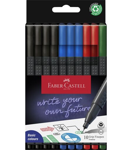 Faber-Castell Grip Fineliner – sæt med 4 klassiske kontorfarver Oplev den præcise og farverige tegne- eller skriveoplevelse med Grip fineliners fra Faber-Castell. Pennene er ideelle til tynde og linjer og skygger og er derfor perfekte til f.eks. skitsetegning, teknisk tegning, optegnelser, prisskilte, detaljerede illustrationer, kreative opgaver eller blot til at tilføje et pop af farve til dine noter og dagbøger. Sæt med 10 fineliners i 4 klassiske kontorfarver (4 stk. sort, 3 stk. blå, 2 stk. rød, 1 stk. grøn) Stregbredde: 0,4 mm Ergonomisk trekantet form Patenteret Grip gribezone, for et sikkert greb Lang spids med metalramme Pennehylser i 56% genanvendt plast Smal metaltip og patenteret gribezone Grip Fineliners er udviklet med en lang smal metaltip, som giver dem en rigtig god præcision og som gør dem særdeles velegnet til brug sammen med skabeloner og linealer. Pennene har et ergonomisk trekantede design og en patenteret Grip gribezone bestående af små gribedupper som sikre et godt og fast greb, så du opnår en komfortabel og skridsikker skriveoplevelse og -komfort, selv under lange sessions. ...