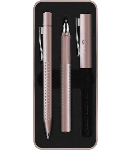 Faber-Castell Grip 2011 Gavesæt med kuglepen og fyldepen Dette elegante Grip 2011 gavesæt fra Faber-Castell med kuglepen og fyldepen kombinerer klassisk design med moderne ergonomi. Grip kuglepennen har en bred XB kugle har en afbalanceret vægt, så den altid ligger godt og sikkert i hånden, hvilken gør den perfekt til dem der skriver meget i hånden. Fyldepennen har en medium spids, som er perfekt til dem, som foretrækker en god balance mellem en fin linjeføring og en bred og glidende skrift. Begge har de det karakteristiske Grip gribemønster, som sikrer et sikkert og komfortabelt greb, hvilket gør dem ideelle til lange skrivesessioner uden træthed i hånden. Type: Gavesæt med kuglepen og fyldepen Farve: Rose Skriftfarve: Blå Stregbredde på kuglepen: XB (ca. 1 mm) Spidstykkelse på fyldepen: Medium Soft grib-zone for en behagelig skriveoplevelse ...