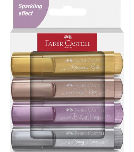 Faber-Castell Highlighter – textliner med glittereffekt Tilføj et strejf af glamour til dine noter med de metalliske textlinere fra Faber-Castell med flotte og strålende glittereffekter. Med sine unikke skinnende og glitrende metallicfarver fremhæver disse overstregningspenne dine vigtigste punkter med stil. Den skrå spids giver dig mulighed for at variere stregbredden i 3 forskellige stregbredder – 1, 2 og 5 mm – så du kan markere præcist, som du ønsker, blot ved at vinkle spidsen forskellige mod papiret. Blækket er hurtigtørrende og giver et strålende og glimtende skær på både standardpapir og specialpapir. Sæt med 4 farver: Guld, rosa, lilla, sølv Faber-Castell farver: Glamorous Gold, Pearl Rose, Brilliant Ruby, Shiny Silver Stregbredde: Fra 1 mm til 5 mm Spids: Skråskåret Vandbaseret blæk med flot glimmereffekt Perfekt til kreative formål De metalliske highlightere er ikke kun gode til klassiske overstregninger, de er også særdeles velegnet som kreative markører og vil give nogle utroligt flotte effekter i f.eks. din bulletjournal, dagbog eller til kreativ kalligrafi. Farverne har den fineste metalliske farve med strålende glitter, som bliver forstærket når lyset rammer og giver en flot wow-effekt til dine overstregninger og kreative dekorationer. ...