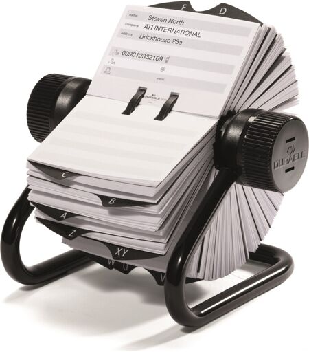 Durable Telindex Adressekartotek – holder styr på adresser og telefonnumreMed dette smarte Telindex adressekartotek fra Durable får du et rullekartotek med en blød rotation og en praktisk låsefunktion. Kartoteket hjælper dig med at holde styr på dine vigtige kontaktpersoner, så de altid er lette at finde og kontakte. Adressekartoteket leveres med 500 dobbeltsidet kartotekskort på 104 x 72 mm så du altid har styr på diverse adresser og telefonnumre. Kartotekskortene er desuden nemme at indsætte og fjerne fra holderen. Samtidig medfølger smarte og praktiske 25-delte indexfaner med inddelingen A-Z, så du hurtigt og nemt kan finde lige præcis det kort du skal bruge.Farve: Sort500 dobbeltsidet kartotekskortMål på kartotekskort (LxB): 104 x 72 mm25-delte indexfaner ...
