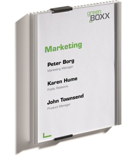Durable Info Sign Skilt – stilrent og enkelt designMed Info Sign skilte fra Durable får du en serie i stilrent design, som passer godt ind i de fleste arbejdsmiljøer. Du kan bruge skiltet til mødelokaler, kontorer og generelt på arbejdspladser hvor du ønsker en identifikation af f.eks. lokaler, afdelinger og personer – du sætter blot skiltet op ved siden af døren, så man hurtigt og nemt kan finde den afdeling, det lokale eller den person man søger. Skiltet monteres nemt på væggen med de medfølgende skruer eller klæbepuder.Det stilrene og enkle design i aluminium passer naturligt og pænt ind i de fleste arbejds- og kontormiljøer og den refleksfri frontplade i akryl, samt det medfølgende neutrale hvide indstik gør skiltet let anvendeligt og læseligt. Dertil kan du selv designe og personliggøre dine skilte ved at bruge en af de gratis skabeloner på www.duraprint.eu.Farve: SølvMål (HxB): 149 x 210 mmFormat: A5Refleksfri frontpladeIndstik, skruer og klæbepuder medfølger ...
