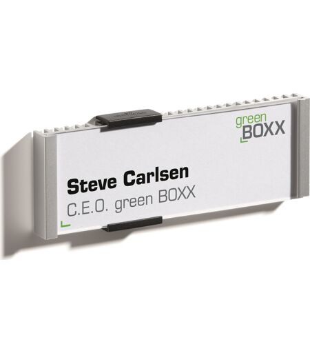 Durable Info Sign Skilt – stilrent og enkelt designMed Info Sign skilte fra Durable får du en serie i stilrent design, som passer godt ind i de fleste arbejdsmiljøer. Du kan bruge skiltet til mødelokaler, kontorer og generelt på arbejdspladser hvor du ønsker en identifikation af f.eks. lokaler, afdelinger og personer – du sætter blot skiltet op ved siden af døren, så man hurtigt og nemt kan finde den afdeling, det lokale eller den person man søger. Skiltet monteres nemt på væggen med de medfølgende skruer eller klæbepuder.Det stilrene og enkle design i aluminium passer naturligt og pænt ind i de fleste arbejds- og kontormiljøer og den refleksfri frontplade i akryl, samt det medfølgende neutrale hvide indstik gør skiltet let anvendeligt og læseligt. Dertil kan du selv designe og personliggøre dine skilte ved at bruge en af de gratis skabeloner på www.duraprint.eu.Farve: SølvMål (HxB): 149 x 52 mmRefleksfri frontpladeIndstik, skruer og klæbepuder medfølger ...