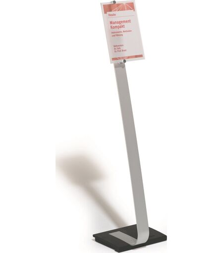Durable Crystal Sign Gulvskilt – elegant og enkelt designMed Crystal Sign gulvskilt fra Durable får du et gulvskilt i et elegant og minimalistisk design, som tager sig godt ud i b.la lobbyer, restauranter, receptioner og til udstillinger. Du kan bruge gulvskiltet til fremvisning og præsentation af materiale i A4 format i både stående og liggende format. Dertil kan skiltet monteres i flere forskellige højder og synsvinklen kan justeres med 10 grader, så det kan tilpasses efter dine ønsker og behov.Selve skilterammen er fremstillet i klar akryl, som holdes sammen af dekorative sølvfarvede skruer, som er monteret på en stabil fod med gummifødder, så skiltet altid står sikkert og fast og præsenterer dit materiale på bedste og flotteste vis.Skiltet leveres med et halvgennemsigtigt indstiksark og ekstra indstik kan tilkøbes. Dertil kan du selv designe og personliggøre dine indstiksetiketter ved at bruge en af de gratis skabeloner på www.duraprint.eu.Farve: SølvFormat: A4Mål i højformat: 1,18 m/1,11 mMål i tværformat: 1,13 m/1,06 mJusterbar højde og læsevinkelIndstik medfølger ...