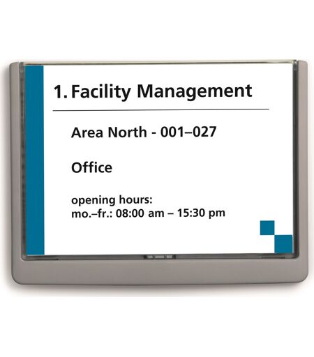 Durable Click Sign Skilt – funktionelt vægskiltesystem Med Click Sign skilte fra Durable får du et smart og funktionelt vægskiltesystem, komplet med farvet kant, gennemsigtig frontplade og hvidt indstik. Du kan bruge skiltet til mødelokaler, kontorer og generelt på arbejdspladser hvor du ønsker en identifikation af f.eks. lokaler, afdelinger og personer – du sætter blot skiltet op ved siden af døren, så man hurtigt og nemt kan finde den afdeling, det lokale eller den person man søger. Skiltet monteres nemt på væggen med de medfølgende skruer eller klæbepuder.Det enkle og moderne design passer naturligt og pænt ind i de fleste arbejdsmiljøer og den klare frontplade gør det nemt at udskifte indstikket i skiltet, da du nemt kan løfte og sænke pladen. Dertil kan du selv designe og personliggøre dine skilte ved at bruge en af de gratis skabeloner på www.duraprint.eu.Farve: GrafitMål (HxB): 210 x 149 mmFormat: A5Nem udskiftning af indstikIndstik, skruer og klæbepuder medfølger ...