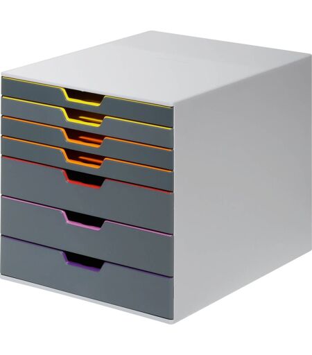 Durable Varicolor Skuffekabinet med 7 skuffer – innovativt og attraktivt design Med Durable Varicolor får du innovative og attraktive skuffebokse med farvestrålende skuffer fremstillet i højeste kvalitet, som passer perfekt ind i det moderne kontor. Dette Varicolor skuffekabinet er udstyret med i alt 7 skuffer bestående af 4 smalle skuffer og 3 standard skuffer, i forskellige og friske farver. Farveopdelingen på skufferne letter og overskueliggør organiseringen af dine dokumenter og papirer og giver dig derved et bedre overblik og en lettere arbejdsgang. Skufferne er lette at åbne og lukke, og er forsynet med udtræksstop så skufferne bliver på sin plads. Dertil leveres skuffeboksen med transparente etiketter til opmærkning, som er udskiftningsvenlige og lette at skifte. På den måde kan du skabe en endnu bedre overskuelighed i hverdagen, så du altid hurtigt og nemt kan finde præcis det du skal bruge. Varicolor er fremstillet med gummifødder på undersiden og kan med fordel stables, så du nemt kan kombinerer flere forskellige sektioner af skuffebokse og derved skabe dit helt eget modulsystem og personlige udtryk på kontoret. Farve: Grå Antal skuffer: 7 Farveopdelte skuffer Kan stables Transparente etiketter til opmærkning medfølger Mål (HxBxD): 29,2 x 28 x 35,6 cm ...
