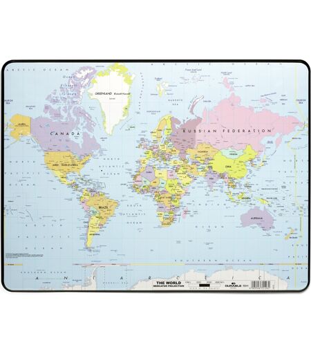 Durable Skriveunderlag Verden – skriveunderlag og verdenskort i étDurable skriveunderlag er tilgængelige i mange forskellige formater, så de passer til dine individuelle krav. Alle skriveunderlagene er behagelige at bruge og kommer i en række stilfulde designs, der passer til enhver arbejdsplads.Med dette Durable skriveunderlag får du et lækkert skriveunderlag i høj kvalitet. Underlaget har et verdenskort indkapslet under en transparent dækplade, som er svejset fast i siderne. Du får altså både et skriveunderlag og et verdenskort i et og samme produkt, samtidig med at du giver dit skrivebord et flot og dekorativt udtryk. Skriveunderlaget har en skridsikker bagside, så underlaget altid ligger godt og fast på skrivebordet og giver dig det bedste skrive- og arbejdsunderlag.Farve: Transparent m. verdenskort Mål (BxH): 530 x 400 mmSkridsikker bagside ...