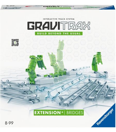 GraviTrax - det innovative modulære system til krævende marmorløb. Fra et stort antal forskellige byggesten og skinner kan actionfyldte ruter planlægges, testes og implementeres med smart brug af fysikkens love. Med de mange udvidelsessæt bliver den gratis konstruktion og design af det innovative GraviTrax-byggesystem endnu mere interessant og spændende hver gang! Flere muligheder - sjovere! Denne udvidelse til et allerede eksisterende startsæt indeholder brodele til at forstørre sporet. Dette bringer endnu mere fleksibilitet til GraviTrax-verdenen! ...