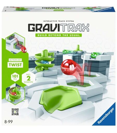 GraviTrax - det innovative modulære system til krævende marmorløb. Fra en række forskellige moduler og skinner kan actionfyldte ruter planlægges, testes og implementeres med smart brug af fysikkens love. Med de mange udvidelsessæt bliver den gratis konstruktion og konstruktion af det innovative GraviTrax-byggesystem endnu mere interessant og spændende hver gang! Med GraviTrax Action Set Twist kan der oprettes varierede og individuelle baner. De medfølgende actionelementer giver mulighed for masser af byggesjov: Spiralen gør det muligt for bolde at overvinde højdeforskelle i et hurtigt tempo, kan samles individuelt i højden og tilpasser sig således perfekt til enhver bane. Trampolinen bringer nyt momentum og energi: sådan skabes et spil med tyngdekraften! Hvor højt og langt kan boldene hoppe? ...