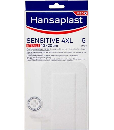Hansaplast Sensitive 4XL er ekstra hudvenlige sårplastre i blødt og åndbart material til at dække og beskytte mellemstore og større sår. God til mindre operationssår. Kan anvendes på sår og rifter. Sikker klæbeevne og klæbefri sårpude. Meget absorberende. Smertefri at fjerne. Latexfri. Sterile. Bemærkning Kun til engangsbrug.Opbevares tørt ved under 25 grader. Dosis og Anvendelse Vask Såret.Tør huden omkring såret eller hudafskrabningen forsigtigt.Sæt plaster på uden at strække det, og undgå, at det rynker. ...
