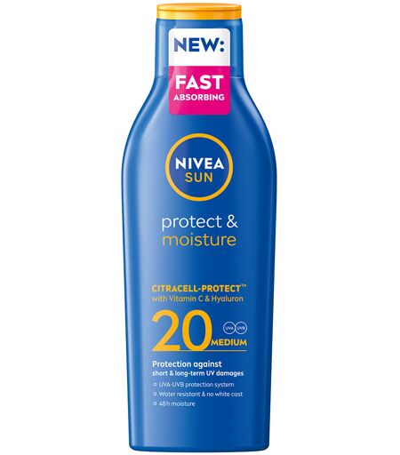 NIVEA SUN Protect & Moisture Sun Lotion SPF 20 beskytter sund hud indefra og udefra. Øjeblikkelig beskyttelse mod UVA- og UVB-stråler, solskoldninger og for tidlig aldring af huden, mens formlen er vandafvisende. Solcremen giver hudbeskyttelse indefra med antioxidativ E-vitamin. Holder huden fugtet i 48 timer og er vandafvisende. Formlen respekterer havet ved at være fri for UV-filtre Octinoxate, Oxybenzone, Octocrylene og fri for mikroplast. 84 % biologisk nedbrydelig formel og 50 % genanvendt plastikflaske og låg (uden etiket). ...